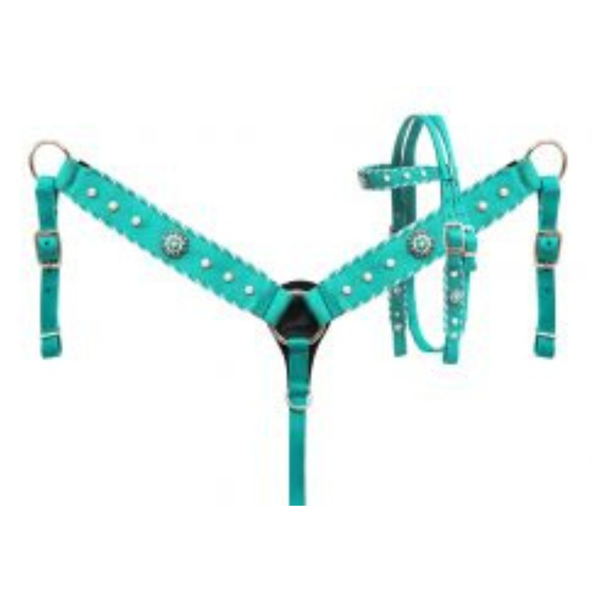 This set features teal nylon with pearl beads and crystal rhinestone conchos. Headstall comes with 5/8" x 6' nylon split reins.