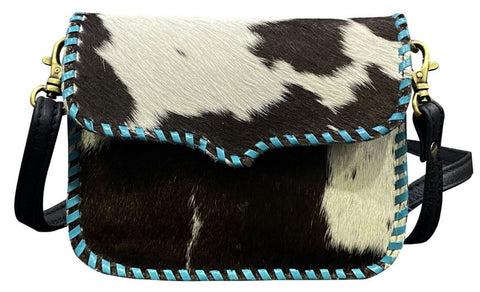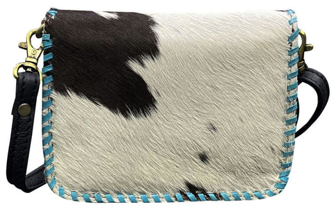 Klassy Cowgirl Leather Hair on Cowhide crossbody bag with teal whipstitching Sale