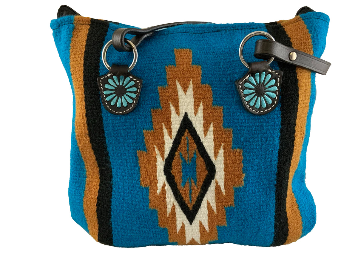 Showman ® Southwest Saddle blanket handbag with genuine leather handle with painted concho accents. This hand bag is made of 100% wool saddle blanket with genuine leather handles. Handbag is lined and includes a inside zipper pocket. Features a zipper closure for privacy and adjustable shoulder strap. Measures 15.5" x 12".