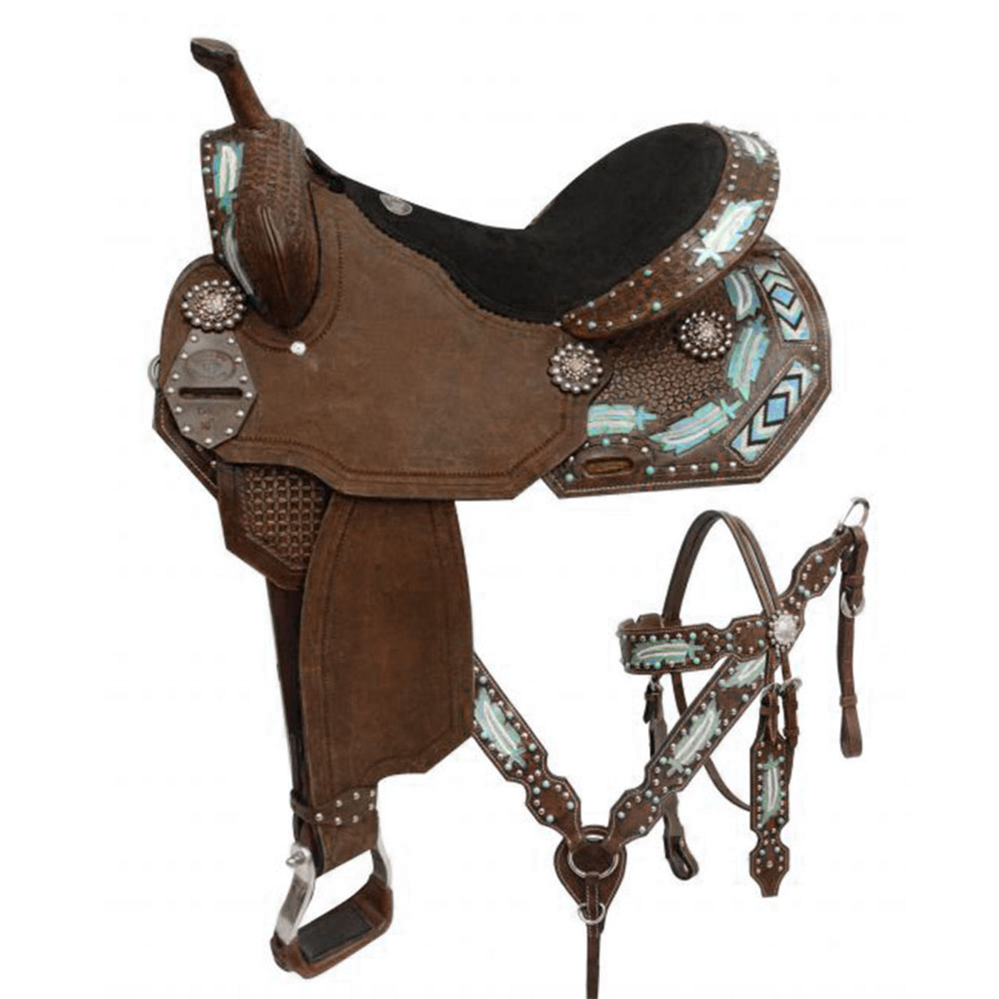 14", 15", 16" Double T style barrel saddle set with metallic painted feathers and beaded inlay. Sale